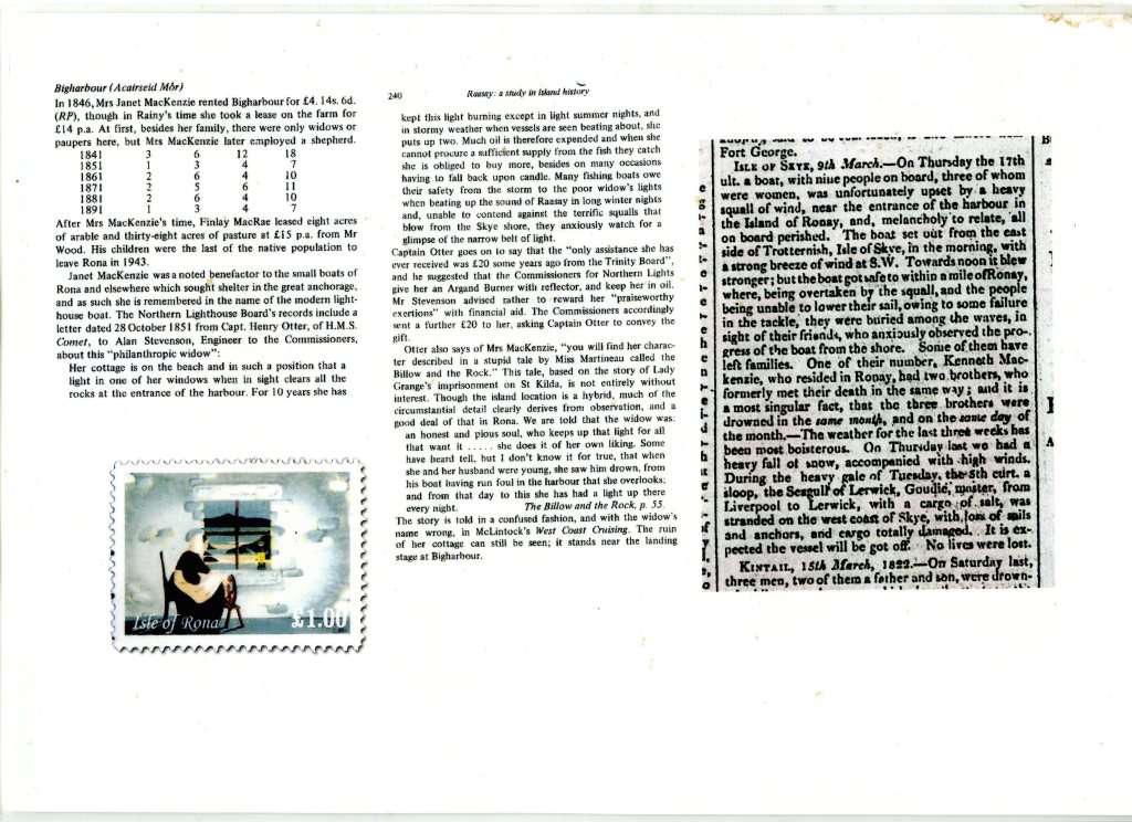 Briefly: Janet MacKenzie lived at Big Harbour (on the farm as it was called then, Acarseid Mhor!). She lost her husband and other members of her family at the mouth of the harbour in the early 1800’s. She thereafter burned, candles, oil lamps and anything she could to maintain a light in the windows looking out to sea to warn seafarers of the treacherous enterance. She did this for 20 years and received a pension from the RNLB. Later in life she followed her son out to Australia where she lived a long life.