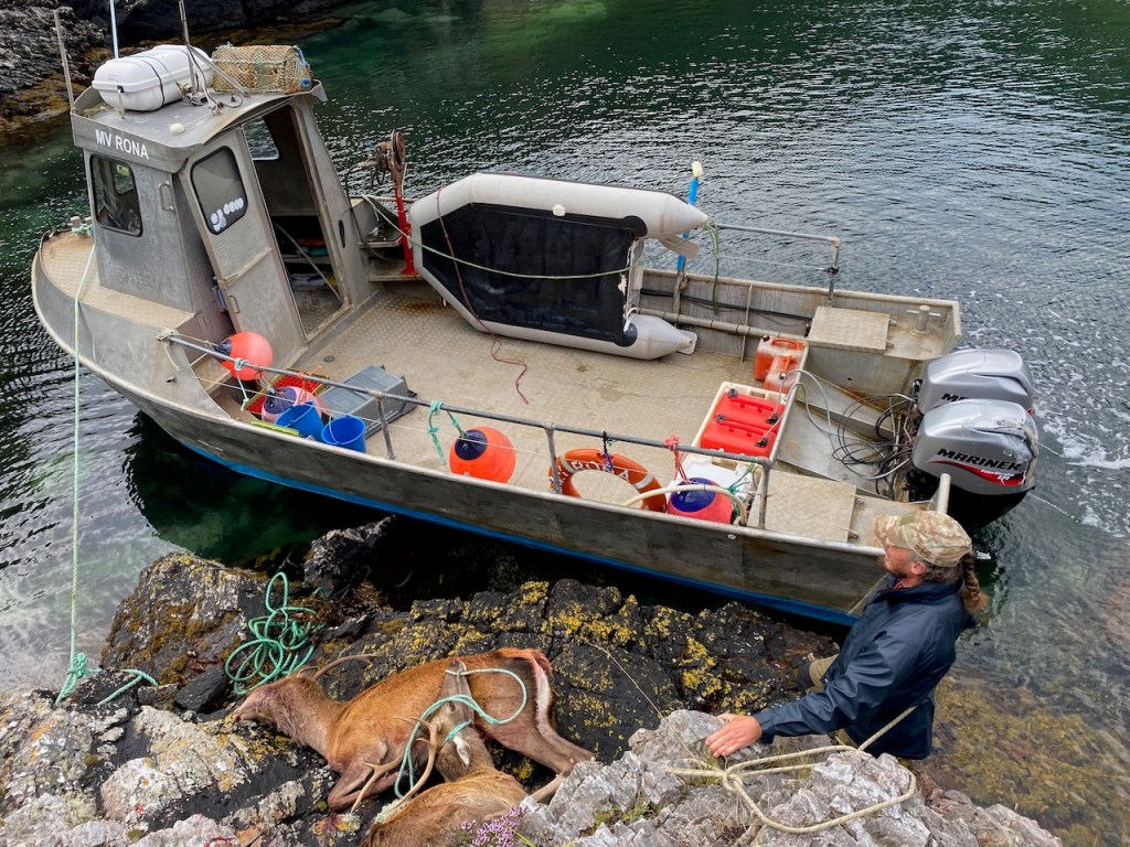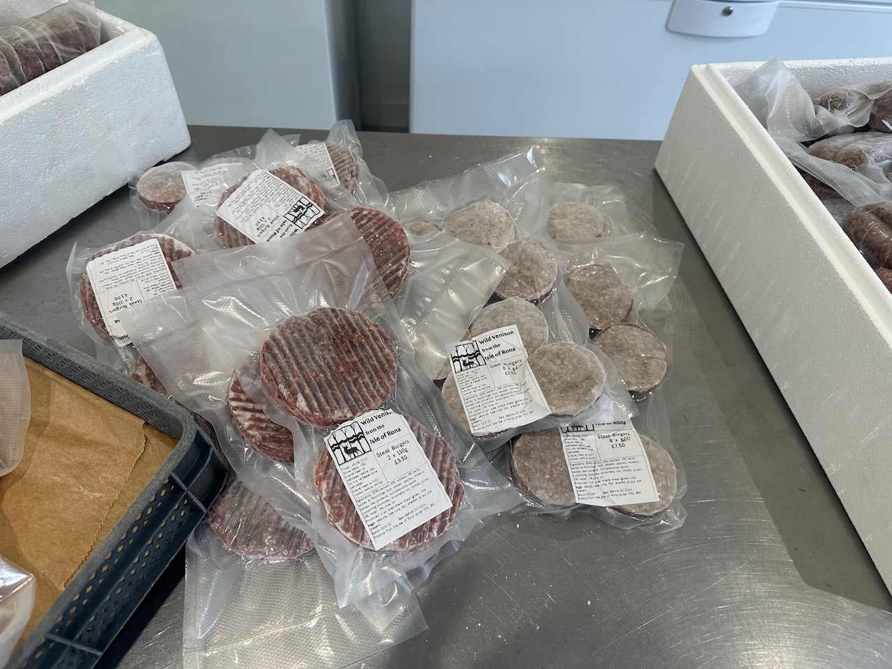 This year it has been about Rona Venison . For sure the deer, especially the calves coming around the house are lovely, the mother here eating a cluster of rowan berries that had fallen from the tree in the wind. But we have a duty to manage the herd and to cull the surplus. Otherwise we would not be doing our job. The end result is our quality venison product. We have had good trade from Raasay House , Skye Wholesale , Donnie’s Tablet shed , not to mention The Harbour chip shop and the many boxes that we have sent across the Sound to Skye this season.