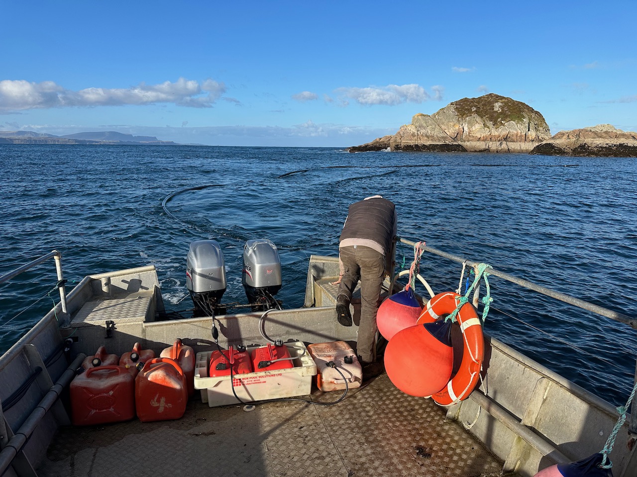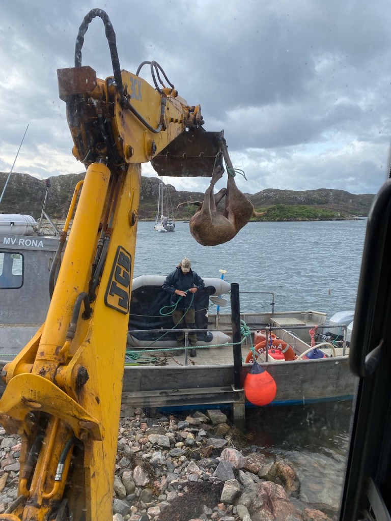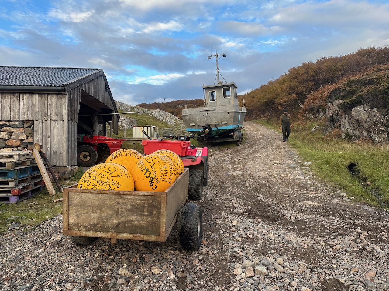 Work goes on. Last week we took the moorings in, although a yacht arrived here last night!!!! Then tried to hook up to one of the marker buoys. The pick ups are all washed, checked and stored, we now await a diver in the spring to check what is under the water. . One of the boats is ashore, the deer are back to what they do best, eating. Whilst stalking we noted long lengths of fish farm pipe all around Rona, this one was particularly long so we decided to take it ashore, second length from the harbour (or just outside) this week. Many years ago our then ferry MV Spindrift struck one with his propellor and the engine nearly ripped a hole through the boat as it stopped the engine dead. The engine mountings taking the brunt of the force, not good.