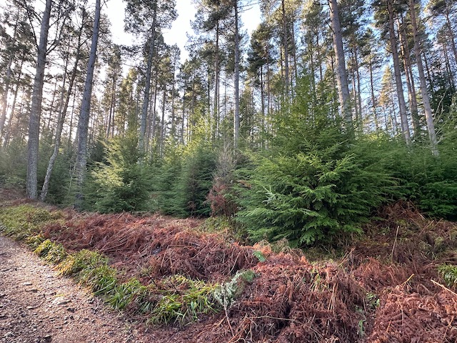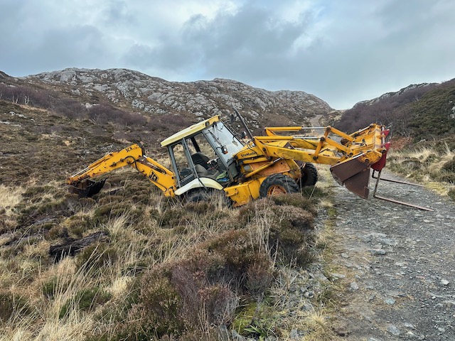 Although not 100% we decided to have a look at where we would plant the Scots Pine we bought from Ronald Christie at Fochabers, I could not pass Arradoul without going in and good to see a busy yard. The JCB was fired up and I took it off road to see how it would get on knowing it would sink a bit. Sink it did but what I did not expect was a burst pipe. So the digger languished there for a while while we searched for new connections only to find we did not have any. A spare extra long pipe was sourced and we were back on the road, sweating and deciding it was better to go back to being sick.