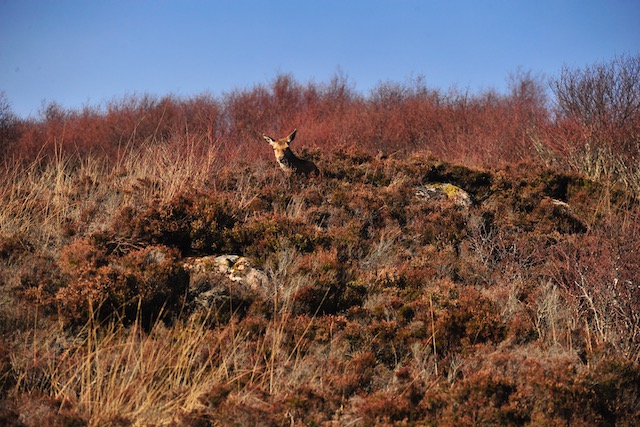 Finally, a hind and calf above the pontoon enjoying the sun deep in the heather, check out the calf’s ears.