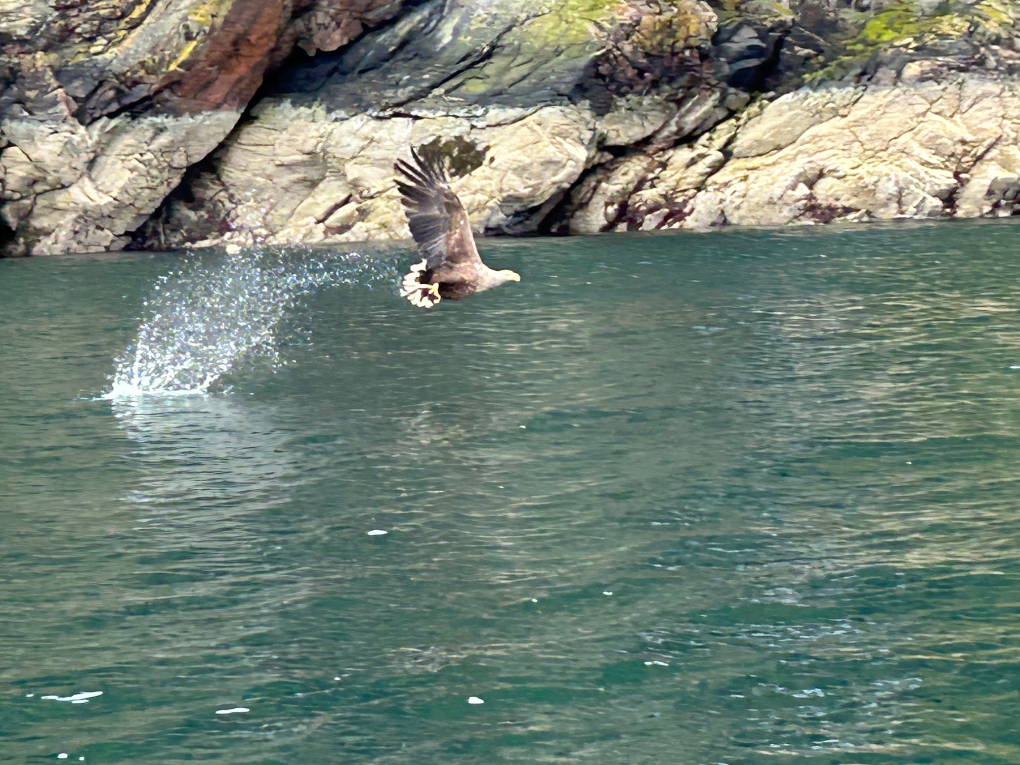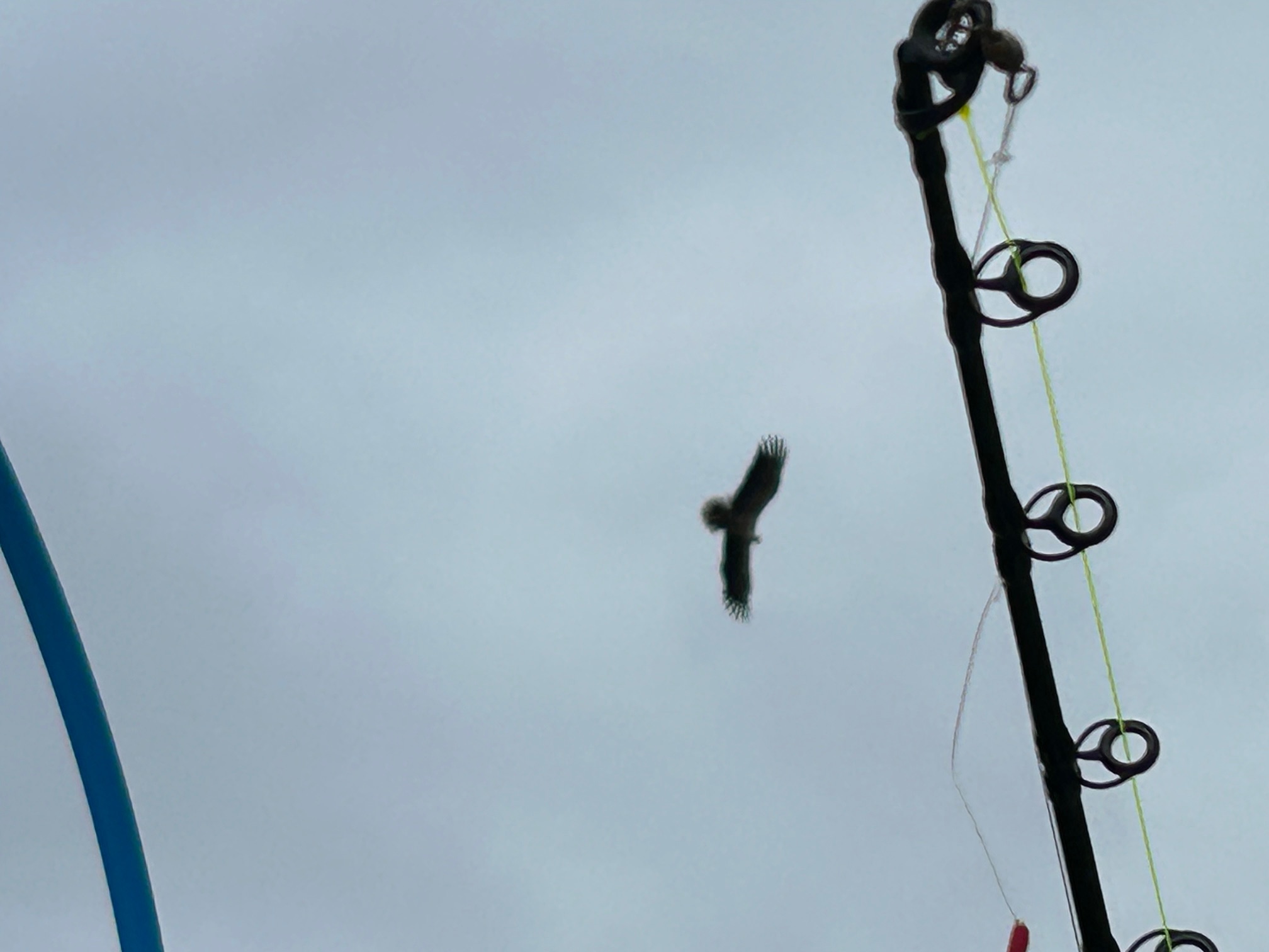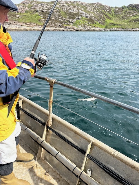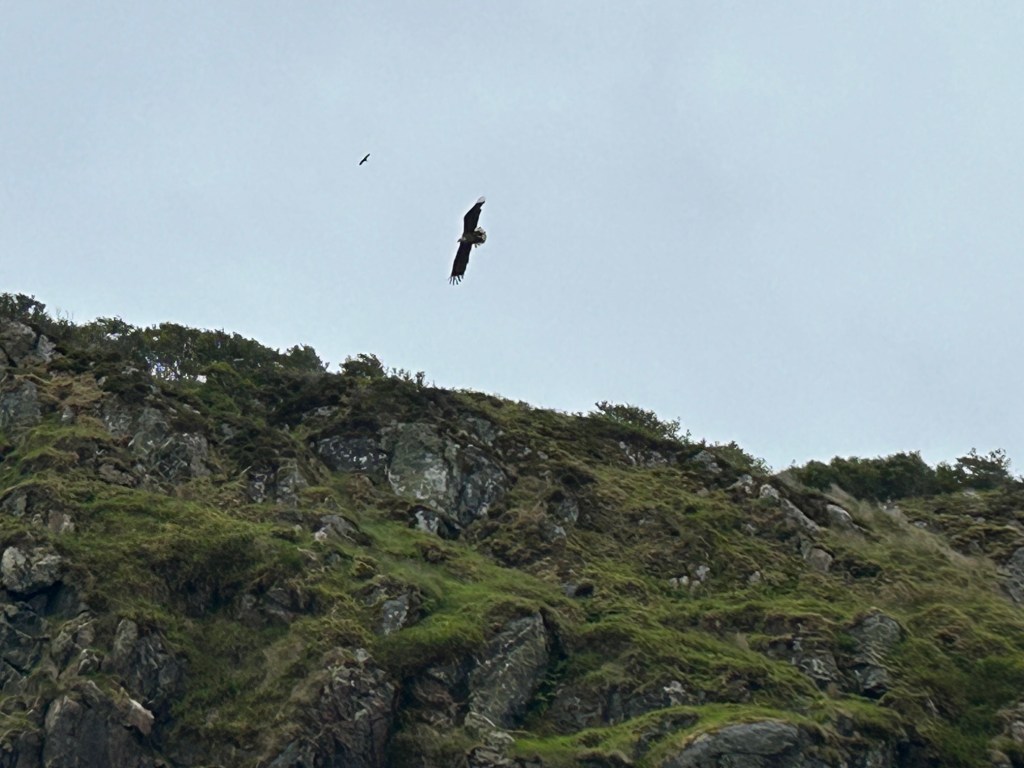 The local pair of Sea Eagles have succesfully reared two chicks (so far) this year on Eilean Tighe. High profile birds that enjoy the freebie fish thrown out by the day trip boats, so when we go out fishing within minutes the sea Eagles arrive circling the boat. Our Danish visitors were thrilled that on each occasion we went out fishing the eagles came and fed on the small fish they had just caught. Whether that is good or bad I guess makes no difference as the eagles pick up the by catch from the fishing boats, so feeding them like this may make them lazy and abandoned by day trip boats in winter (although the Sea Eagles will move closer to Portree to feed) there are still fishing boats throwing out by-catch all year round.