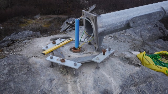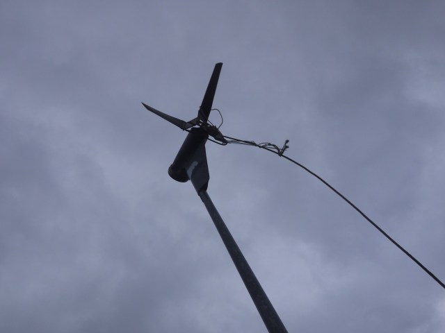 We noticed on Saturday that the volts were not too high despite the wind, on Sunday morning I went to check and the Windmill head was wobbling pretty bad. Looked like a spring had broken, it was out of balance big time. The brake to stop it broke when it was nearly new and has never worked. So to stop it before it shook itself to bits I had to throw a rope into the blades.