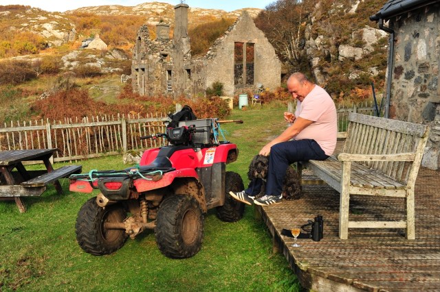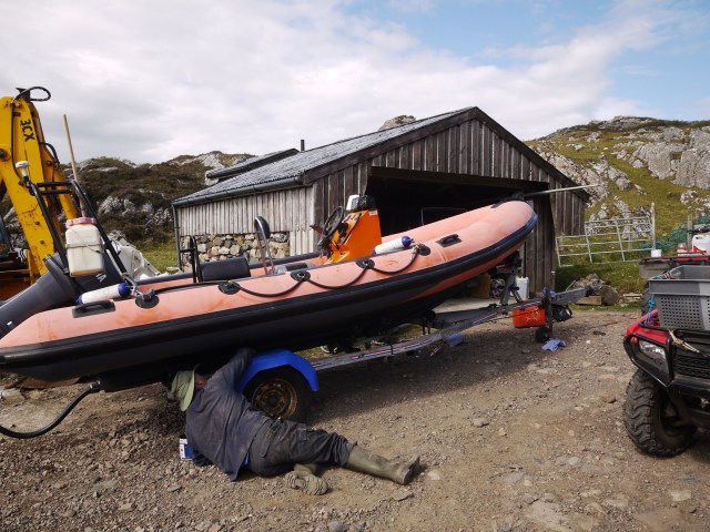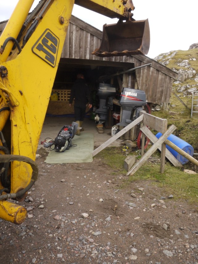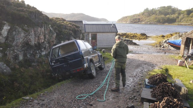 Back to reality and it was the stalking season the following week. Our guests from Germany arrived and our new caretakers in the Lodge were having their first season of Deer Stalking guests. Matt and Nickie had arrived in June and were settled in the Lodge. All new to Island life but they took to it well. Sorting out the back log of work and the odd mishap such as this enthusiastic tow out of the shed!