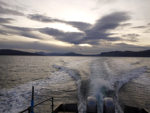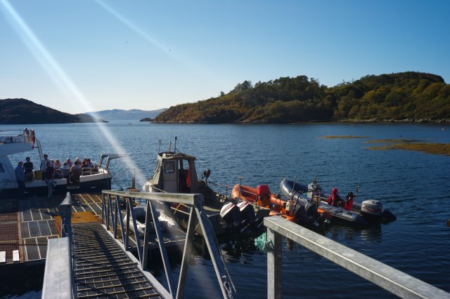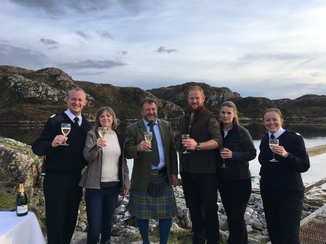 On the back of this trip and after chatting with our guide on the train, Marilyn, we contacted the ‘Hebridean Princess’. We had had a text with a photo of the Hebridean Princess cruising past Rona whilst on the train. It was cruising in the area on its last of the season cruise when we were on the train and we commented that we were always disappointed that it had never called in in the past. A week later when it was still in the area and we were home on the Island, we received a call from the Purser and they dropped anchor at the mouth of the harbour then unloaded 40 people by flit boat onto the Island. It was good to see them at last enjoying Rona in late Autumn sunshine helped along with the odd bottle of Tattinger. The passengers were happy to be the first ‘HP’ guests to set foot on Rona.