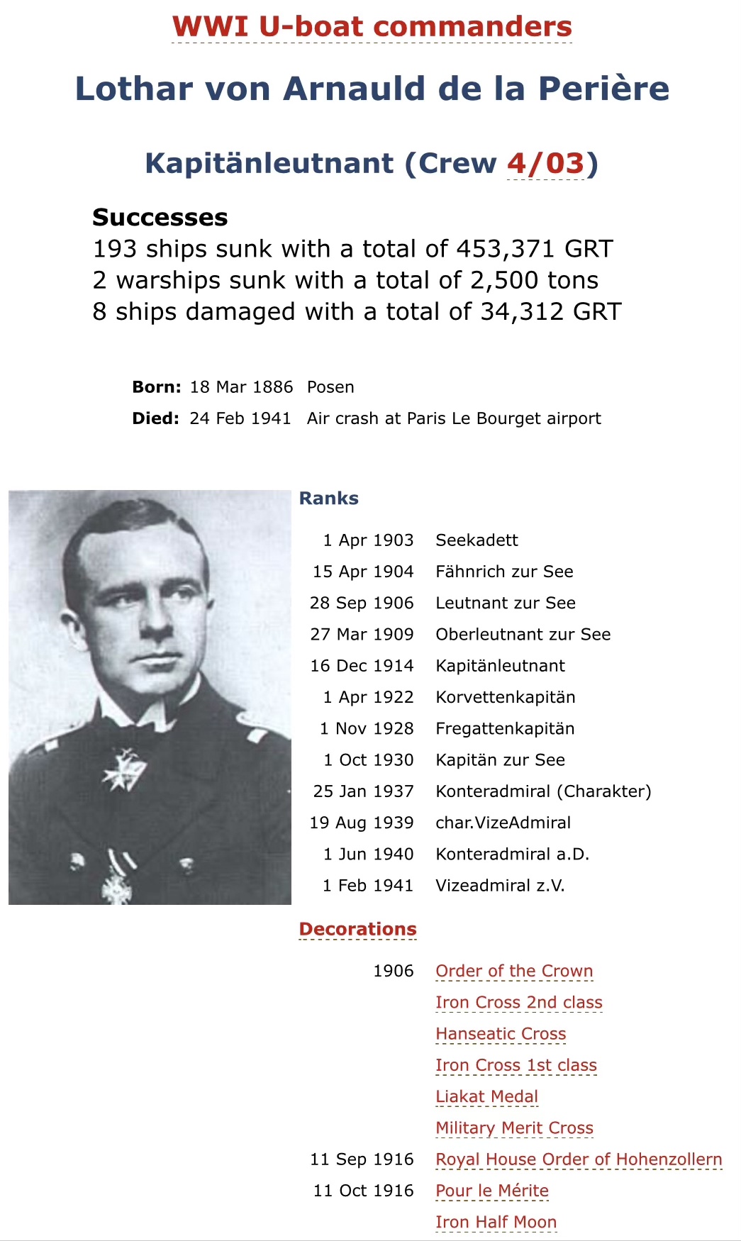 An interesting register and to quote: ” it was torpedoed on 18th June 1916 off the coast of Sardinia by the U-35 u-boat, commanded by this guy”.
