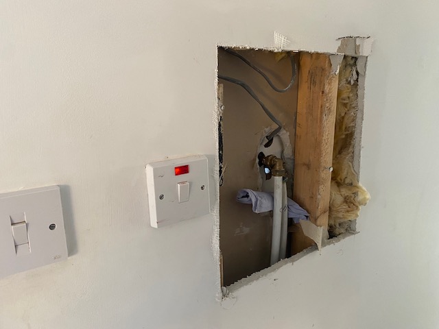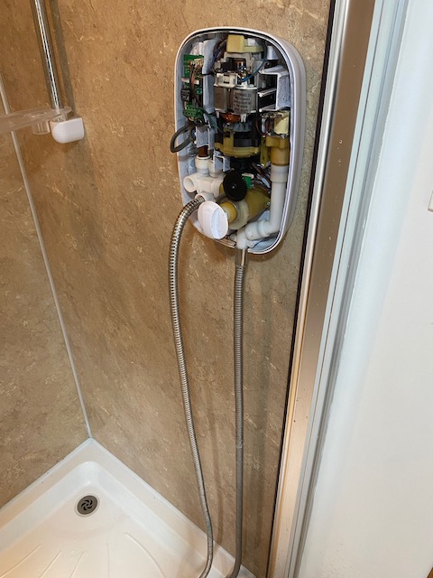 The catch up continues, last year a hydraulic hose burst on the JCB as we tried to lift/drag the boat into the sea, the bucket landed on one engine, fortunately it did not do too much damage and we were not held up (very lucky). The hull is not in good shape but we repaired it a few years ago and it is standing up very well. So much so the new boat is parked. Our trial visitors are now coming to an end, we have Work Aways for a short while then a new start for a new couple. Decision time looms. Our many visitors have pointed out quite a few repair and maintenanmce issues so the aftermath is I get to do them. The lodge shower was a difficult one until I remembered an old shower unit in the shed, problem solved as I took the parts from it. Pity about the hole in the wall. Now a hatch.