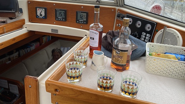 Our new (old) boat has been lying out of the water since September last. Just no time to do anything with it but turn the engineover now and again. But it floated, then ran and now up for sale. A wee dram to celebrate once John MacInnes on Yacht Shivinish cast his eye over it.