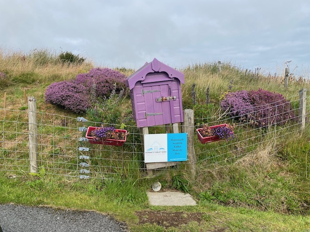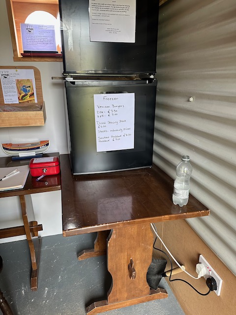 This weekend after a fantastic week our guests were sorry to leave, no wonder with the weeks weather they had. I wonder what they would make of to-day. The air was so clear and views crisp last week, sunsets galore. In the mail our new freezer, at last frozen venison for sale at the pier. Self Service on Rona. We took a leaf out of Donnie’s book.