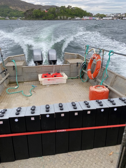 The batteries duly arrived at Skye Express and the weather meant they sat there for a while before I could uplift them. Whilst I reckon I’m pretty fit lifting 24 batteries at 53kg each was a tall order. I left Rona in calm weather and thought it was 6.45am, but I had miss read the clock in the bedroom and it was only 5.45am. I reached Portree at 6.45am, no one about apart from the guys at Skye Express so I loaded half in the the batteries into car and crept down to the pier. I loaded them myself and took off back to Rona with half a tonne of batteries.