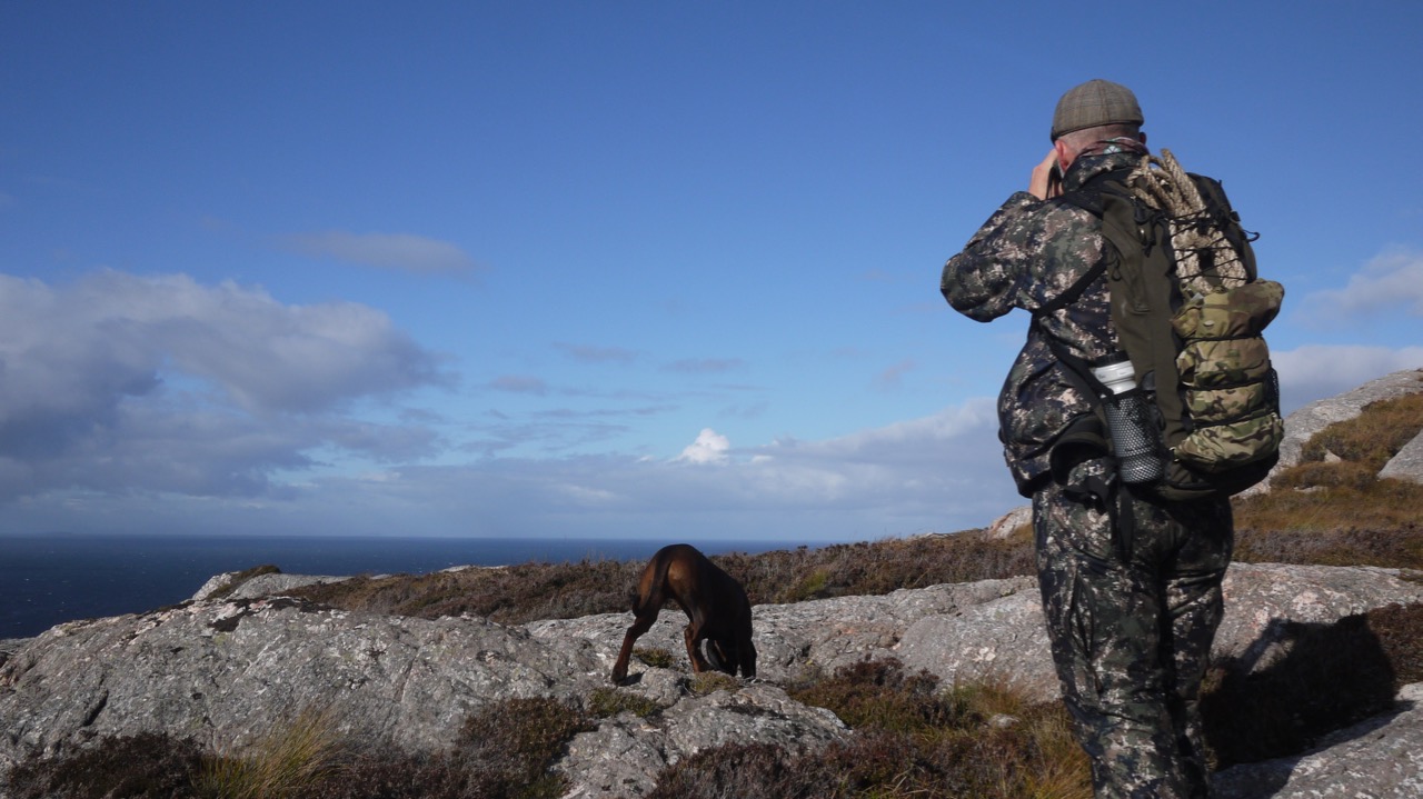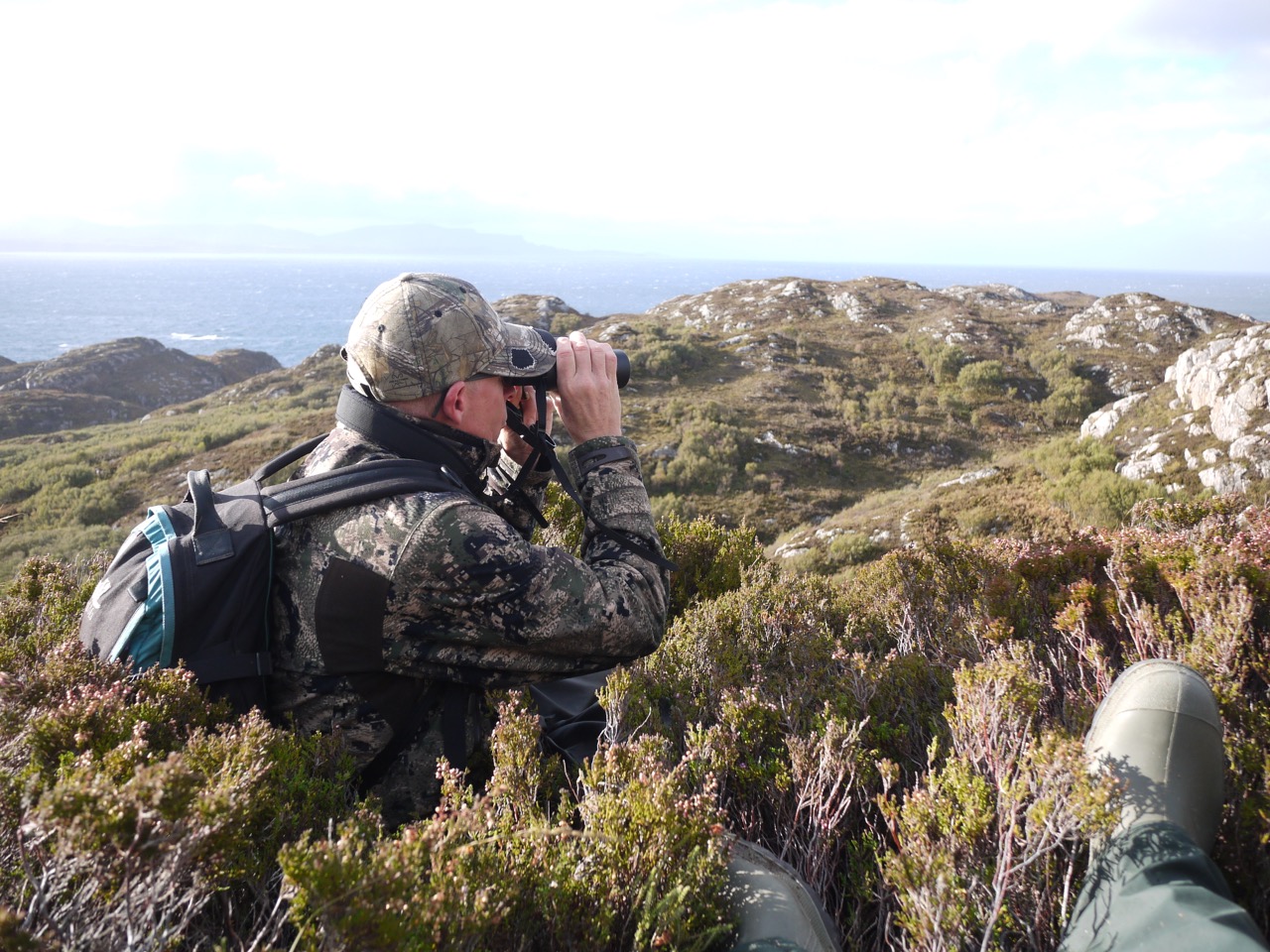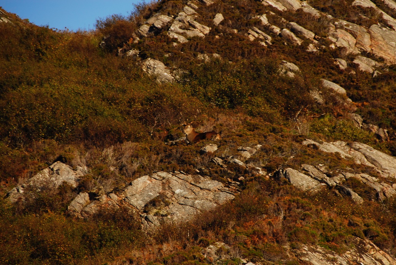 We got the stag on board and decided as the morning was so clear to have a walk further on but with no rifle this time. We had a good spy over to Raasay but all we could see was the local shepherd, gathering sheep. Although some of the sheep were looking down on him from the highest point, all bunched up and not playing the game. We had been sitting for a while with the noise of a boat in the background rather than roaring stags when an Ullapool dive boat appeared, close in looking for scallops. We moved further out and came onto a hind lying down enjoying the early morning sun. We crawled in to see if there was a stag with her but when we got to our chosen spot we could see that she had seen us, was not happy and was off, closely followed by a big stag that must have been lying in cover.