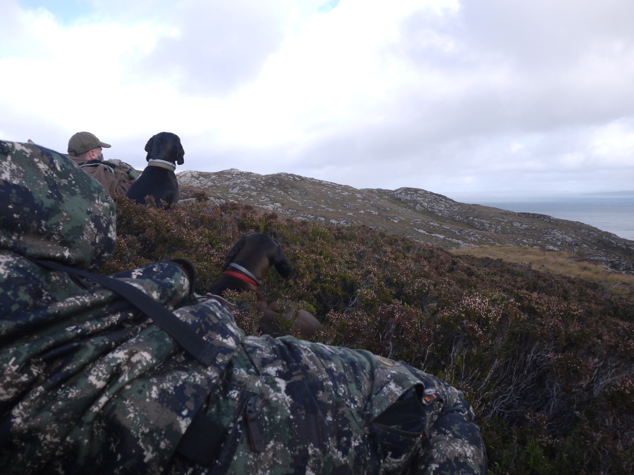 So it was good for the guests to have a day off the hill and doing something different. The weeks stalking resumed on Wednesday and we had a cracking day with two good stalks ending with 3 hinds. Our guests were wondering how we would stalk every day on such a small Island for a week without disturbing all the deer and making it impossible. But even with the wind behind us on this day we split up into two parties and both headed South down the East and West sides of the Island. Dave had quite quick success and good shooting accounting for a hind and calf. Our party of three, with the extra head were on the West side and had a great stalk into a couple of groups of hinds, Mark took the lead and managed to get his guest into position and to take a good shot accounting for a yeld hind