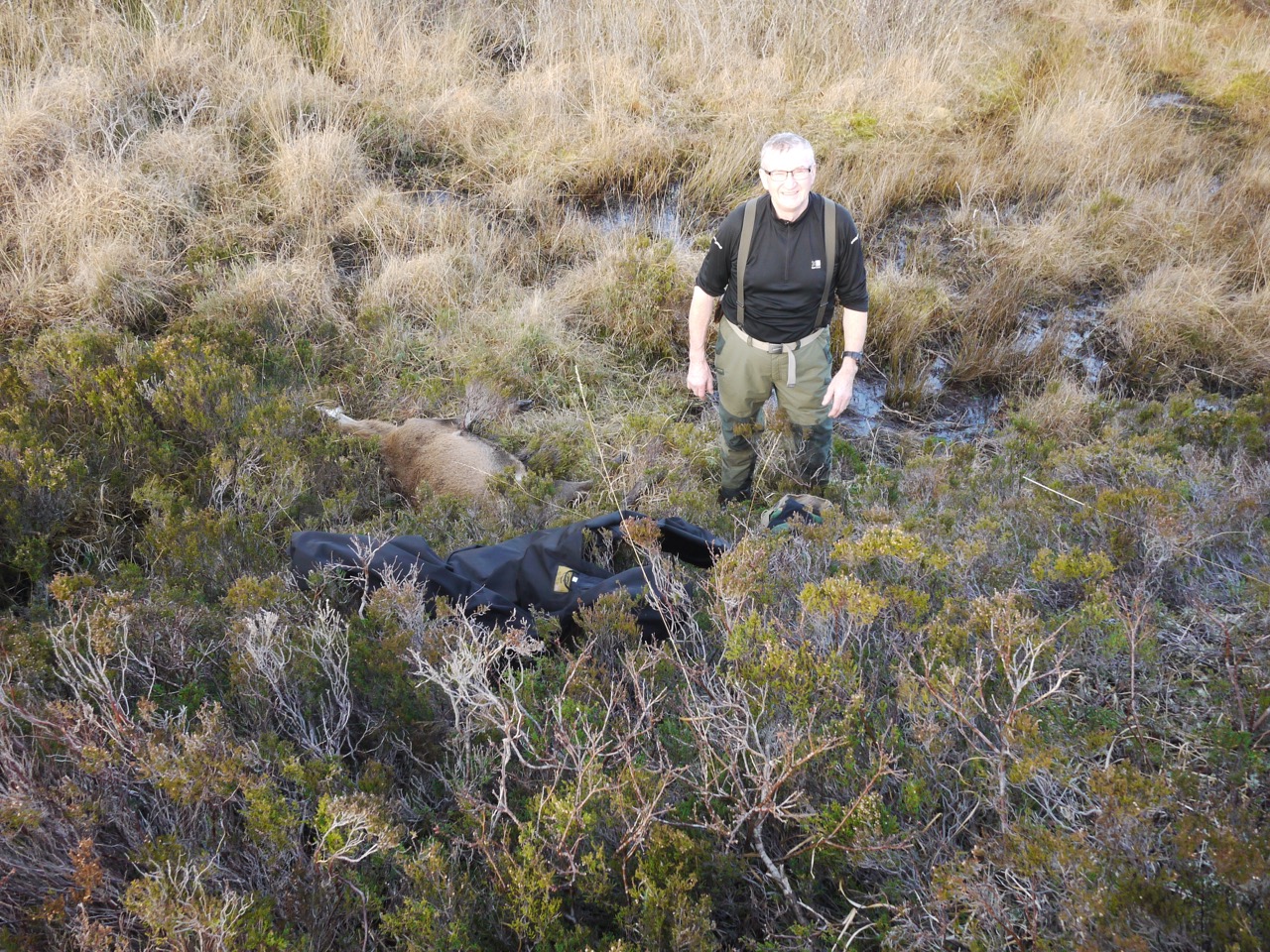 Off we went again, time moving on, now into the afternoon. Just as I was about to call it a day I saw a group of deer. On further investigation we had three hinds one calf, which one to shoot? We made the decision and started to crawl in only to find we could only get to within 200 metres and with a very strong wind it was deemed to far. So we backed off had another really long detour, a bit of climbing or cliff walking (scary) and we were approaching to about 80 metres. Once in position my guest could not see the deer. Much swearing in Dutch later (very like Scottish swearing) my guest saw them, quickly found the chosen target and carried out the shot very well. Now the fun.