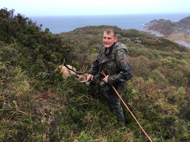 Later that day the stalkers on their return to base decided to head out North with the wind and head back down the seldom stalked East side. It is difficult to extract the deer here but they were keen. I headed up to a high hill South of them and quickly saw the group in the valley approaching from the East, it was obvious they were stalking and next thing I heard the shot. I got the call shortly after that to say they had had a good stalk and had got their stag. We quickly picked it up and back at the larder we had one very happy Heiko.