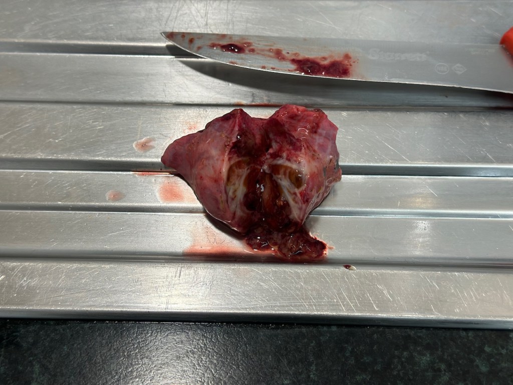 Back at the larder we always check the ‘gralloch’ for any issues, there are the normal parasites on wet ground which are of no harm, but one of the deer had a dodgy liver. Also a growth on its lung.