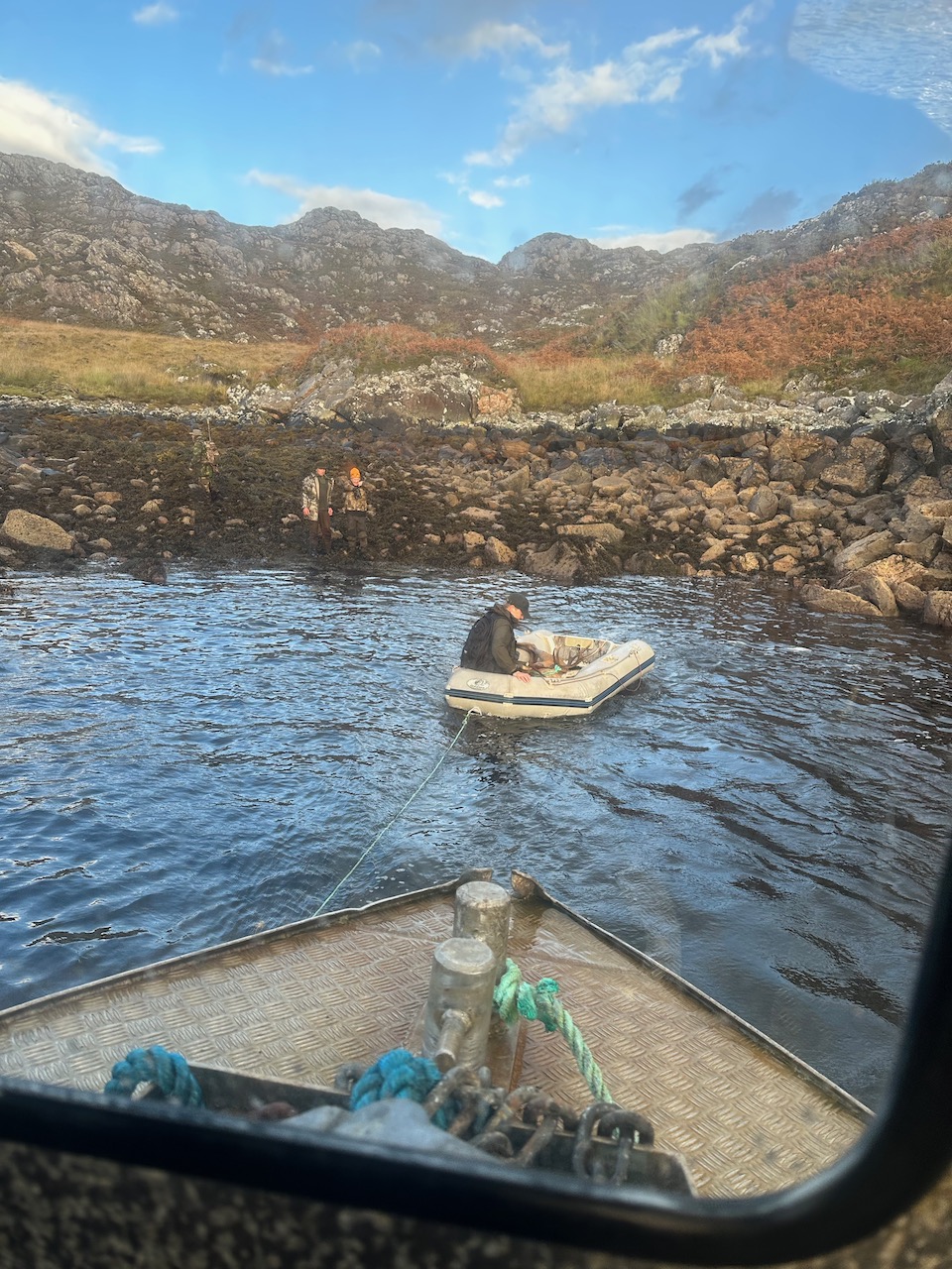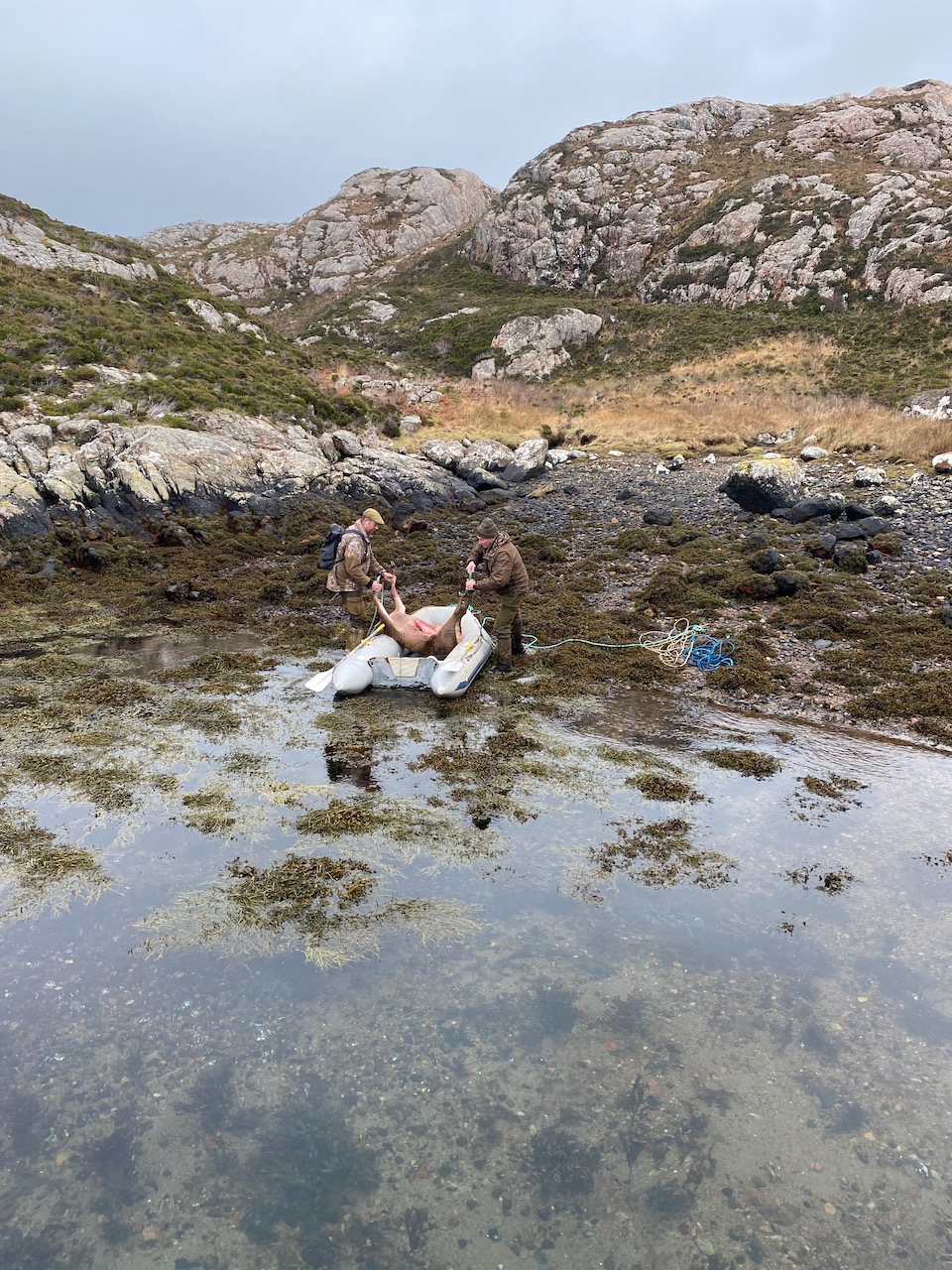 The hind ended up well down a deep valley so rather than drag it up a steep face we got the boat and collected the deer (and guests) in the dinghy, the easiest option.