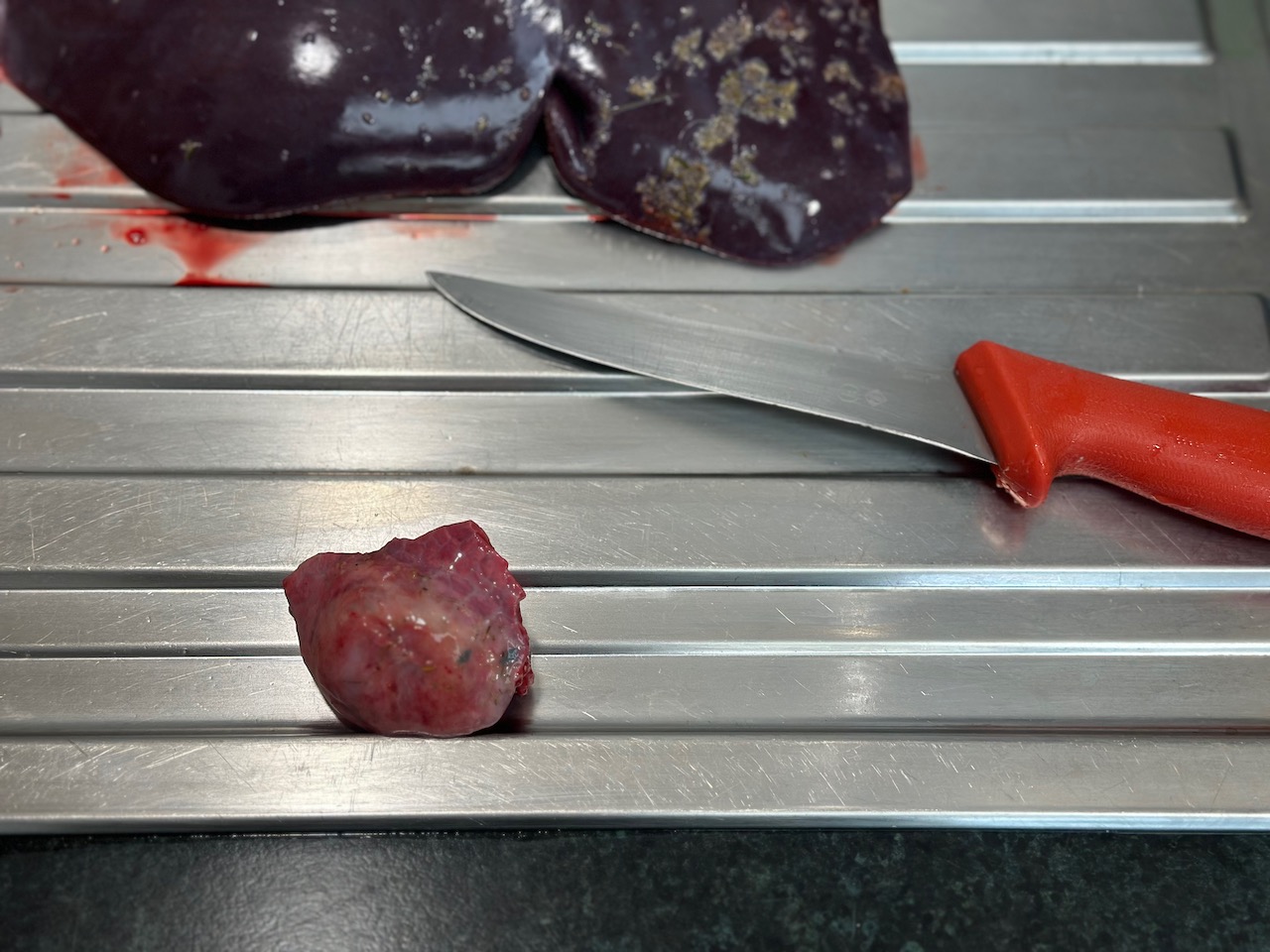 Back at the larder we always check the ‘gralloch’ for any issues, there are the normal parasites on wet ground which are of no harm, but one of the deer had a dodgy liver. Also a growth on its lung.