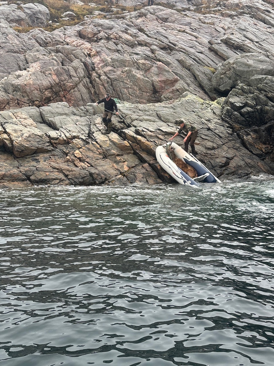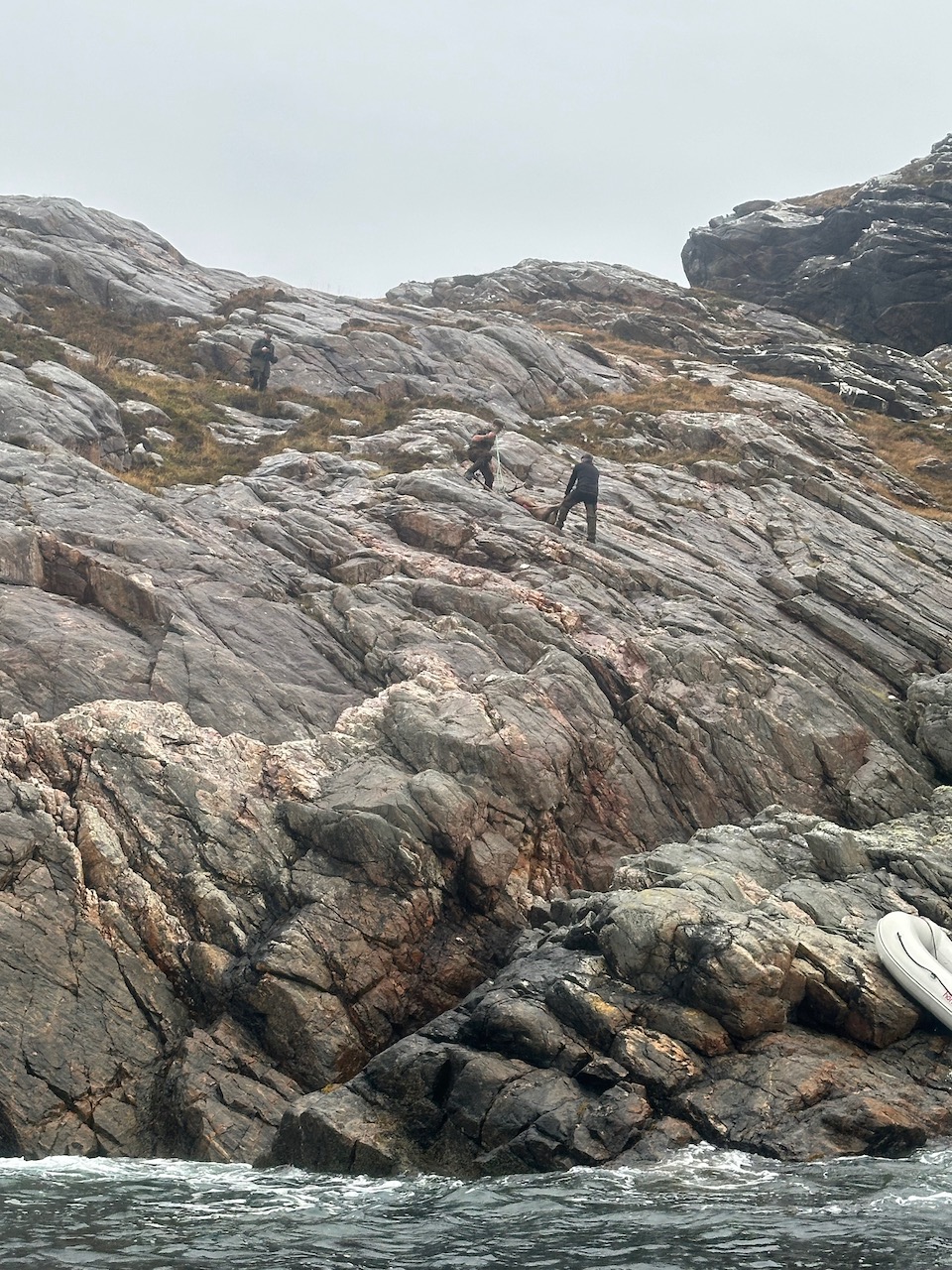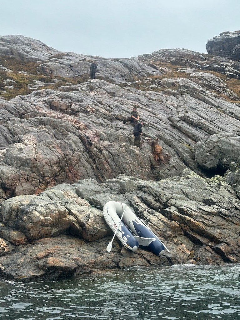 Knud has been coming to Rona now for over 10 years, we think 12. He is a very good stalker, very calm and enjoys Rona. I think it is his second (hunting) home. So for the first outing I let him take his Sister Inger out, he was the stalker , she was the guest. I was the boatman. I dropped them off on the rocks on the West side, a North Westerly swell was coming in but we got a good shelf and the Alu’ boat did not mind a few bumps, they took off. I did not get right back into the harbour and the phone went off. Come back, we have shot a stag!!! So myself and Per, got organised, got some more rope and headed off for the pick up. Inger and Knud had just got up onto the first ridge when they spied an ideal candidate. A good short stalk in and Inger, who is a very good shot, did the deed, but the stag decided not to play ball and toppled over a cliff.