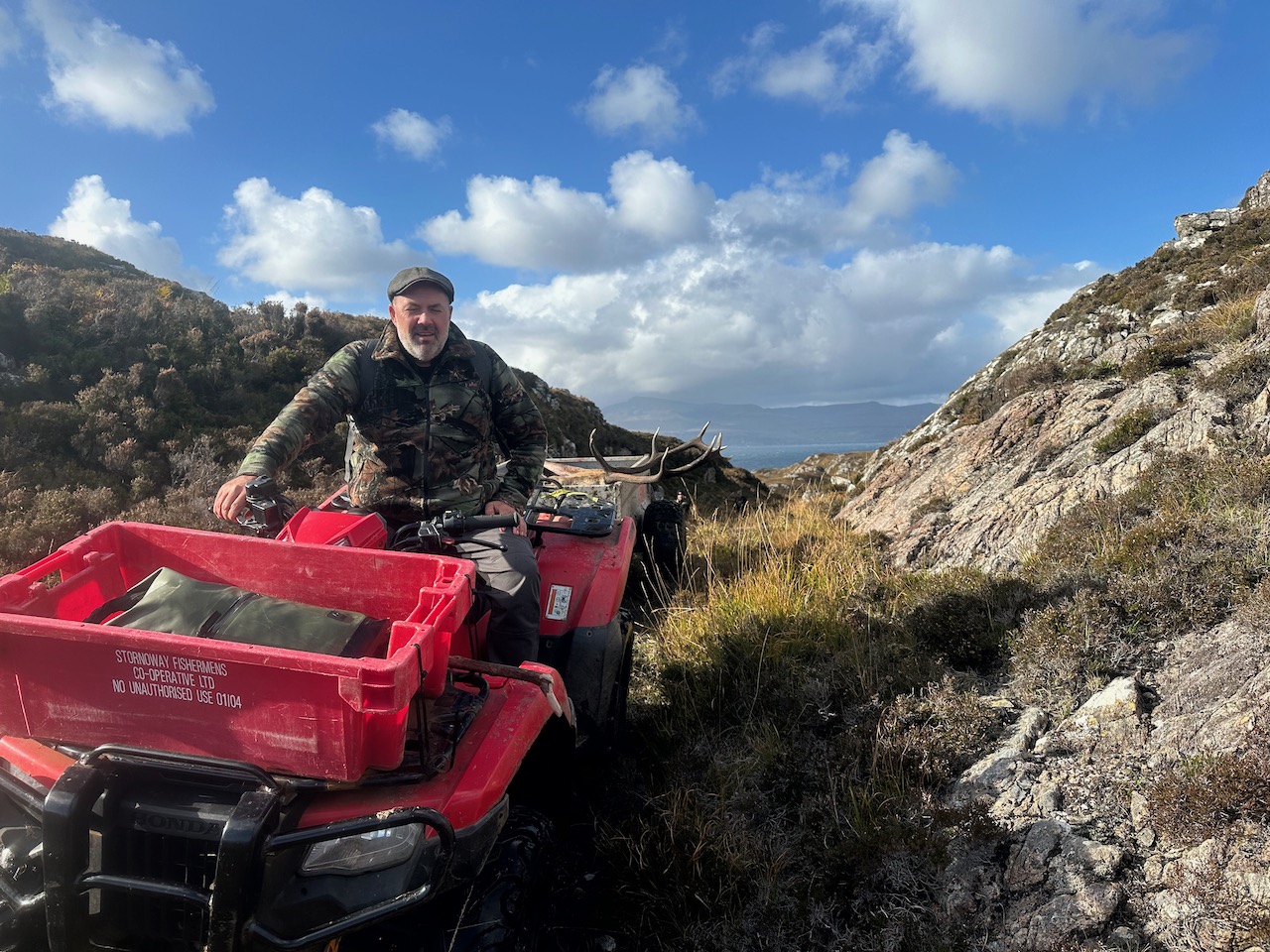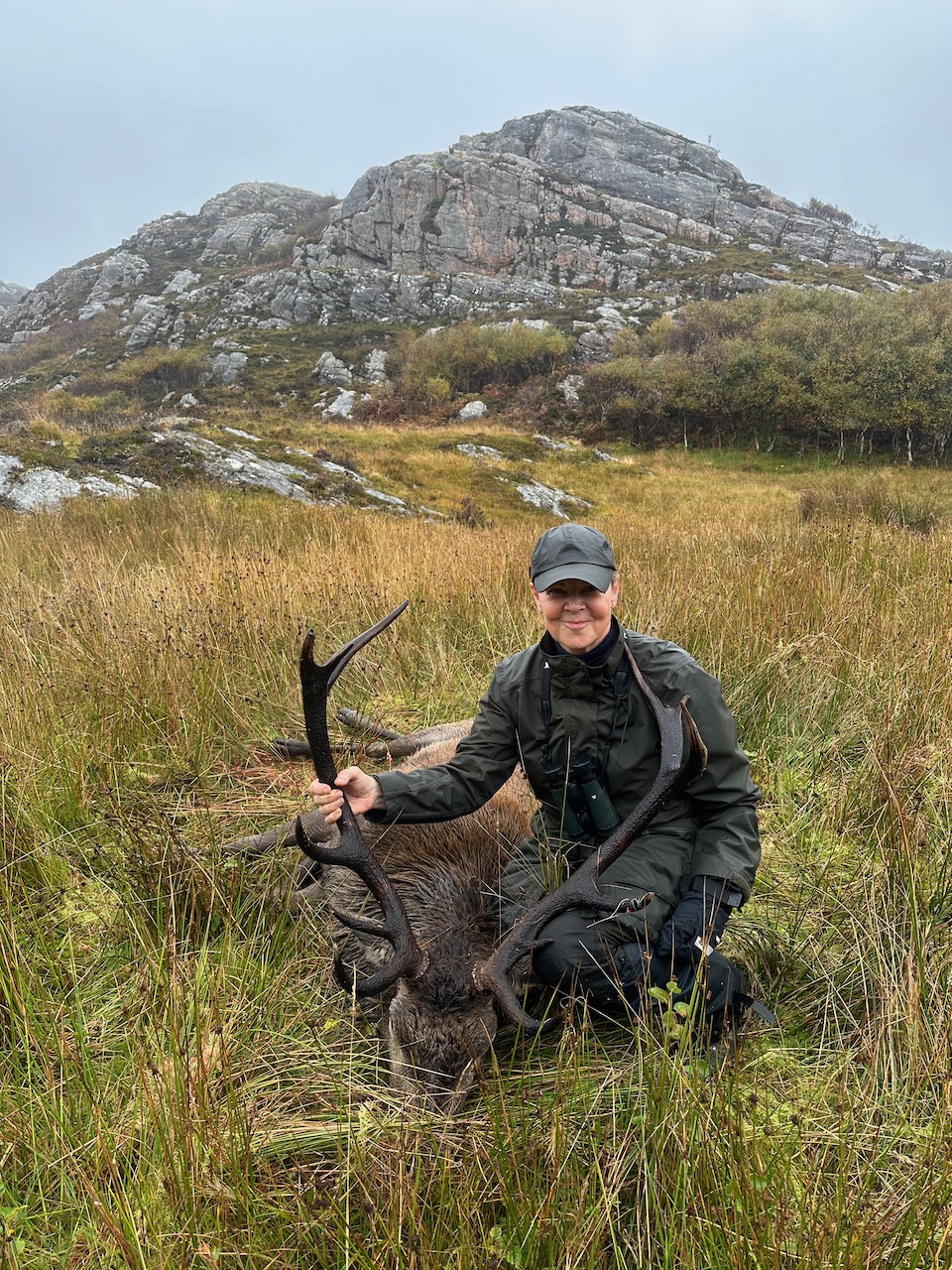 This was broken antler from last year, he took up residence around Big Harbour but was rutting out in the Outrun, we stalked into him and found ourselves in an elevated position, now to wait. We could not see him but he would not show, I told Inger to stay put whilst I went forward. There he was in the trees roaring for Rona. I thought he may follow the hinds and true to form he came out of the forest but running. I roared, he stopped, I said to Inger take him and she duly did. A calm perfect shot. His days were over and I had a very (shaky) but happy hunter yet again. Back to the larder, drams , beers and the stalk was talked about, a lot.